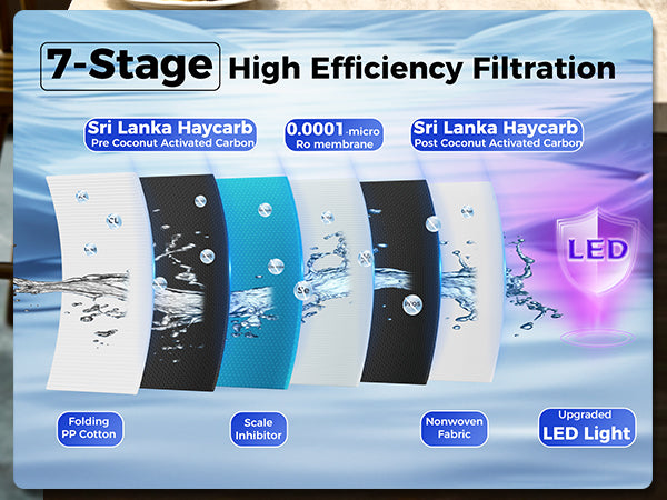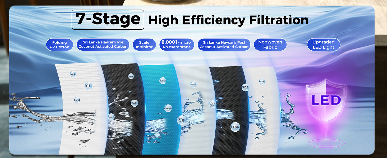[Composite 100 Gallon RO Membrane Filter] Upgraded to 6-stage filtration with an impressive 0.0001μm accuracy, this RO filter eliminates 99.99% of over 1,000 contaminants, including chlorine, lead, heavy metals, fluoride, mercury, VOCs, chloramine, arsenic, and more. Ensures the highest level of water purity and safety for your home.
